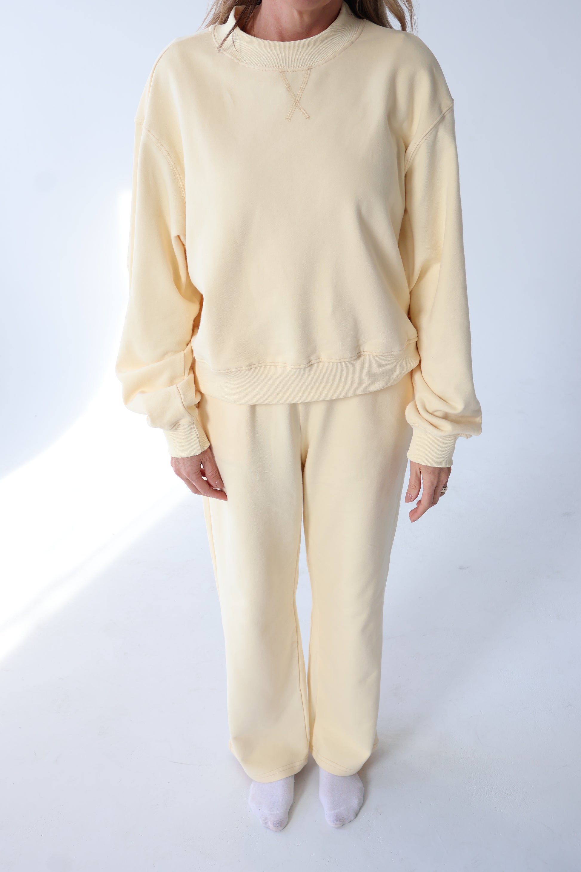A soft Butter Yellow set made from premium 100% cotton fleece. The mockneck has a structured fit, and the relaxed wide-leg bottoms keep it comfortable and easy to wear. Simple, clean, and made to last.