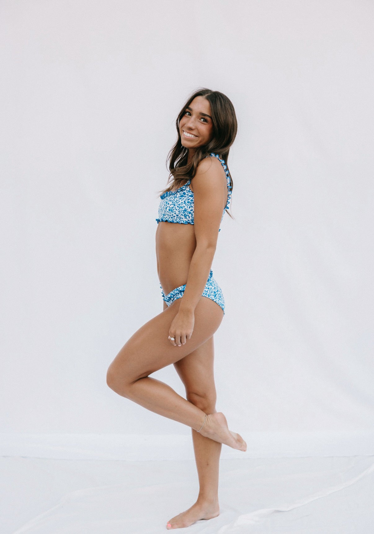 This scoop neck bikini top features a soft blue and white floral print with delicate ruffle detailing along the neckline. Designed for a flattering, supportive fit with adjustable straps and double-lined fabric for added comfort